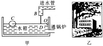 (1)图甲为冷水自控装置,小水箱与锅炉相连.当杠杆呈水平状态时,浮球受到2.5N竖直向上的浮力,塞子B刚好顶住自来水进口.已知OC=25cm,OD=1cm,塞子B横截面积为1 cm2,由此算出自来水压强为多大?(不计杠杆、连杆、塞子、浮球的质量)