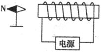 3.(4分)下图中,根据通电螺线管左端小磁线的指向标出螺线管的N、S极及电源正负极。
