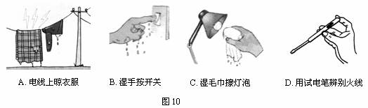 12.人们的学习、生活和工作都离不开电,在生活中树立安全用电意识十分重要,图10做法中符合安全原则的是 ( )