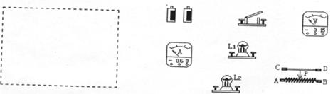 3.在下图中,要求用电流表测量灯泡L2中的电流(0.3A),电压表测量灯泡L1的电压,L1、L2并联,变阻器调节L1的亮度,开关控制整个电路,将符合要求的电路图画在虚线框内,并将实物连接起来.