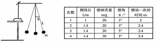 22.(6分)在研究摆钟的摆球摆动情况时,小菲和同学们观察摆钟后,利用如图所示的装置进行实验,测出了摆球摆动30次所用的时间,用这个时间除以30,得出摆球摆动一次所用的时间。针对摆球摆动一次所用的时间与哪些因素有关这一问题,他们提出了以下猜想: A、可能与摆球质量有关; B、可能与摆线的长短有关; C、可能与摆角的大小有关。他们利用以下器材:质量不同的两个小钢球、长度不同的两根细线、一个铁架台、一只秒表,进行了以下四次实验。