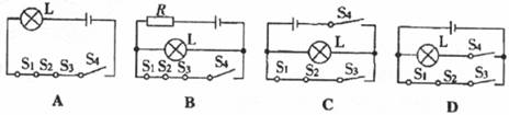 14.小轿车上都装有一个用来提醒司机是否关好车门的指示灯,四个车门中只要有一个门没关好(相当于一个开关断开),该指示灯就会发光,(R为保护电路的电阻),图中所示的模拟电路图符合要求的是