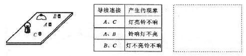 3.(4分)某电路中有一个封闭的电路盒,面板上有A、B、C三个接线柱及灯泡、电铃各一个。为了探究盒内电路结构,小明做了多次实验,实验结果记录如下表.根据实验情况,请你在虚线框内画出电路盒内的电路图。