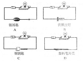 7.如下图所示,用导线把灯泡、电池和四种物品分别相连.灯泡一定不发光的