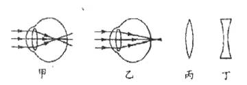 14.人的眼睛在结构上和照相机非常相似,晶状体相当于一个凸透镜,能使物体在视网膜上成像。在下图甲、乙示意图中,属于近视眼的是______ (选填“甲”或“乙”),矫正时配戴的眼镜镜片应选用_______(选填“丙”或“丁”)。