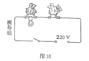 22. 图10卡通画中,电路一旦接通,哪只鸟有触电危险?哪只鸟相对安全?请分析说明理由。