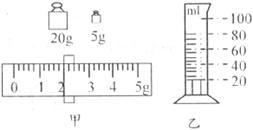 (1)用调节好的天平称一个物体的质量,当把物体放到天平左盘时,右盘中的砝码和游码所处的位置如下图甲所示,天平平衡,请你将数据记录在下表一中。