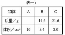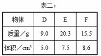 (3)小明又测量了三个不同物体的质量和体积,并将数据记录在表二中,请你根据表二中的数据在图丙的坐标纸上用“×”描点。观察分析可知物体D、E、F与物体B、C的关系为:__________________________________________________。