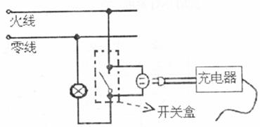 23.小明家买了一辆电动车,回家后却发现一个难题:车库里只有一盏灯,但没有充电用的插座。于是爸爸打开灯的开关盒,看到里面有两个接线柱,他便从这两个接线柱上引出两根导线,接上一个插座,如下图所示。接好后插上充电器,却发现电灯亮了,但亮度明显偏暗。