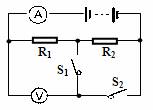 35.如图所示,电源电压为15V,R1=5Ω,R2=10Ω,求(1)当开关S1、S2均闭合时,电流表的读数是多少。(2)当S1闭合,S2断开时,电压表的读数是多少。
