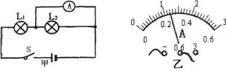18.如下图甲所示电路中,L1、L2是两盏相同的灯泡,开关闭合后,电流表表盘如图乙所示。则流经灯泡L1电流为_______A,灯泡L1和L2的亮暗程度:____________________