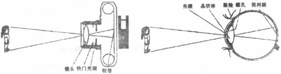 15.人类和某些动物的眼睛很像一架照相机,如下图。下表是小明所列的眼睛和照相机类似的部位的比较,请你帮他补充完整。