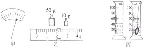 (3)用天平称矿石的质量,把矿石放在天平的左盘。天平平衡时,放在右盘中的砝码和游码在标尺上的位置如上图乙所示;量筒量出矿石的体积如上图丙所示,由此可知,矿石的密度