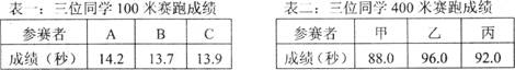 3.在校运会上,几位同学分别进行了百米赛跑和400米赛跑,他们的成绩如表一、表二所示,则:(1)在百米赛跑中获得第一名的是_______同学,这里比较三人赛跑快慢采用的方法是相同的路程比较所用的时间; (2)百米跑的第一名和400米赛跑的第一名,哪个更快?答:________更快(填参赛者代号)。在这里比较他们在赛跑中的快慢,所采用的方法是___________________________________。