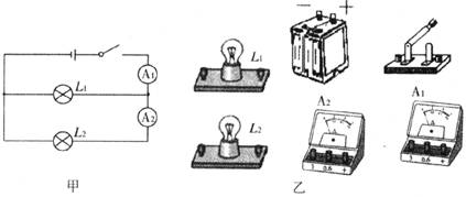 26.根据下图甲所示的电路图,将图乙中的实物,用笔画线表示导线,将它们连接起来。(估计通过每个灯泡的电流约为0.4-0.6A,导线不能有交叉)