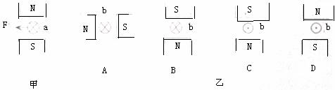 表示电流的方向垂直于纸面向里,⊙表示电流的方向垂直于纸面向外。如下图所示,甲图表示直导体a在磁场中,受到一个既跟电流方向垂直又跟磁感线方向垂直的水平向左的磁场力F,乙图所示的四种情况中,通电导体b受到的磁场力方向水平向左的是