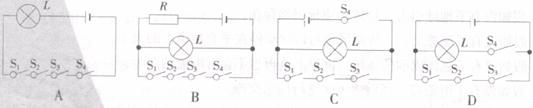 17.小轿车上都装有一个用来提醒司机是否关好车门的指示灯,四个车门中只要有一个门没关好(相当于一个开关断开),该指示灯就会发光。下图所示的模拟电路图中符合要求的是