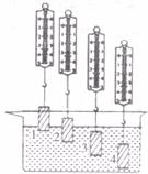 为了验证上述猜想,李明做了如下图所示的实验。他在弹簧测力计下端挂一个铁块,依次把它缓缓地浸入水中不同位置,在这一实验中: