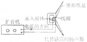 6.作为一种应急措施,有时也可以用扬声器代替话筒。如下图所示装置,人对着扬声器的锥形纸盆说话,声音就会使与纸盆相连的线圈在磁场中振动,从而产生随着声音的变化而变化的___________。这种现象在物理学上称为___________现象。