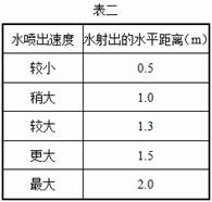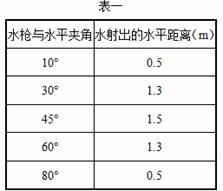 32.(4分)小军同学帮爸爸用水枪喷水洗车时,发现当水枪朝上角度不同或水喷出速度不同时,水射出的距离是不同的。为此,他进行了认真的探究一与探究二活动(如下图所示)相应的数据记录如表一、表二。