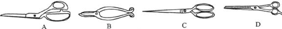 9.如下图所示,各式各样的剪刀可以看作是杠杆,现在小明做手工想剪开一块铁皮,那么最合适的剪刀是 ( )