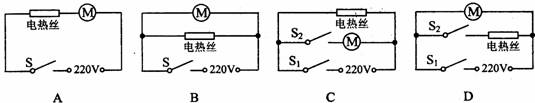 6.家用电吹风机由电动机和电热丝等组成,为了保证电吹风机的安全使用,要求电动机不工作时,电热丝不能发热。电热丝不发热时,电动机仍能工作。下图电路中符合要求的是