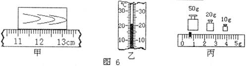 16.图6中,甲所示的用刻度尺测量物体的长度,所测物体的长度是________mm;图乙为某一寒暑表刻度的一部分,其读数为________℃;用天平测物体的质量,天平平衡时,右盘中的砝码和游码在标度尺上位置如图丙所示,测物体的质量是________g.