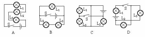 6.在图所示的四个电路中,闭合开关S,三盏灯都能发光。若其中任意一盏灯的灯丝烧断,其它两盏灯仍然发光的,一定是电路图