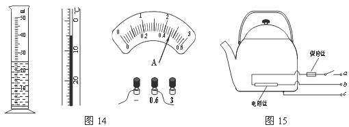 20.(3分)正确读数是做好物理实验的关键,如图14所示,量筒中液体的体积是________;温度计显示的温度是___________;电流表的示数是_________。