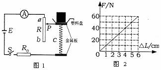 27.学习了电学相关知识后,学校举办了一次综合实践活动,活动的主题是利用电流表或电压表制作一个简易电子秤.下图1是小红设计的电子秤原理图,其中E为干电池(2节);A是电流表(电子秤示数表盘);R0是定值电阻(5Ω);R是一根长为6cm阻值为15Ω的均匀电阻丝.c是一根弹簧,其所受压力F与压缩量△L的关系如下图2所示(塑料盘的重力不计,g取10N/kg,制作时,调整弹簧的长度,使之不称重物时滑片P刚好在电阻丝的a端。