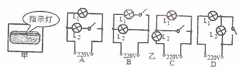 11.如图甲图所示,家庭照明灯的一种按键开头上有一个指示灯,在实际使用中发现,当开关闭合时,只有照明灯发光;开关断开时,照明灯熄灭,指示灯会发出微弱的光,以便夜间显示开关的位置。据此开关的控制特性,能正确表示照明灯(L1)和指示灯(L2)连接方式的电路图是乙图中的