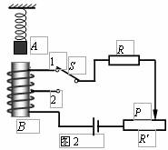 6.如图所示,A是悬挂在弹簧下的铁块,B是螺线管的铁芯,S是转换开关(S接1时连入电路的线圈匝数多,S接2时连入电路的线圈匝数少),P是滑动变阻器的滑片。要使弹簧的长度变长,可采取的办法是