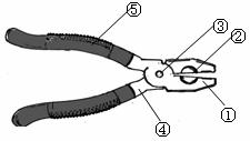 25、生活中一些看似平常的工具却蕴含着丰富的物理知识,如图所示的夹钳就是其中一例,图中①齿状钳口;②刀口;③转轴;④手柄;⑤带齿纹的橡胶柄套。请简要说出其中两处各应用了什么物理知识。
