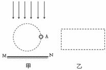 30、如图甲所示,一束平行太阳光垂直水平地面MN射下,A为小铁球。(1)标出小铁球A在甲图中位置时,其影子A′在地面MN上的位置(用点表示即可);(2)若小球在竖直平面内沿图中圆形虚线轨迹运动,请在图乙框中画出小球的影子在地面上运动的轨迹。