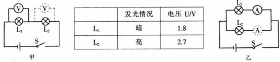 (2)一位同学用干电池做电源,把L1‘‘2.5 V 0.3 A”和L2“3.8 V 0.3 A”两只灯泡连成如图甲所示电路.闭合开关进行实验.收集证据如下表: