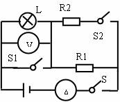 10.(09赤峰)如图所示电路,电源电压不变,当开关S闭合。S1、S2断开时,电流表的示数为I1,电压表的示数为U1;当开关S、S1、S2都闭合时,电流表的示数为I2,电压表的示数为U2。则下列说法正确的是