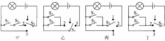 9.一辆卡车驾驶室内的灯泡,由左右两道门上的开关Sl、S2和车内司机右上方的开关S3共同控制。S1和S2分别由左右两道门的开、关来控制:门打开后,S1和S2闭合,门关上后,Sl和S2断开。S3是一个单刀三掷开关,根据需要可将其置于三个不同位置。在一个电路中,要求在三个开关的共同控制下,分别具有如下三个功能:(1)无论门开还是关,灯都不亮;(2)打开两道门中的任意一道或两道都打开时,灯就亮,两道门都关上时,灯不亮;(3)无论门开还是关,灯都亮。图所示的四幅图中,符合上述要求的电路是