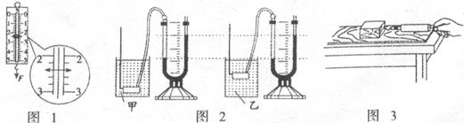 22.如下图1所示,弹簧测力计读数是_________N,其分度值是_________N;将同一压强计的金属盒先后放入甲、乙两种液体中,现象如下图2所示。由此现象可得到的结论是___________________________;如下图3所示,在研究滑动摩擦力的大小跟哪些因素有关的实验中,用弹簧秤_________拉动木块,从而测出摩擦力的大小,若将木块由平放滑动改为侧放滑动,木块受到的摩擦力_________。(填“变大”“变小”或“不变”)