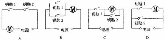 6.某机要室大门控制电路的两把钥匙分别由两名工作人员保管,单把钥匙无法打开,下图电路中最为可行的是