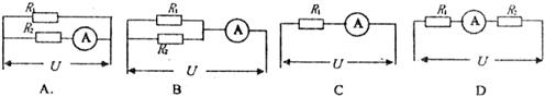 3.如下图所示的四个电路中,电压U都相等,并且电阻R1>R2,电流表示数最小的是