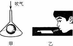 27.如图甲所示,小丽同学在倒置的漏斗里放一个乒乓球,用手指托住乒乓球,然后从漏斗口向下用力吹气,并将手指移开,可看到乒乓球不会下落,此实验现象说明: 。同组的小刚同学设计了如图乙所示的小实验,他把一张半卷着的硬纸片摆放在桌子上,当用力向硬纸片的下面吹气时,可以发现硬纸片 。(请你根据所学知识推测实验现象)
