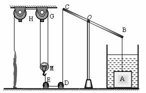 40.某校科技小组的同学设计了一个从水中打捞物体的模型,如图所示。其中D、E、G、H都是定滑轮,M是动滑轮,杠杆BC可绕O点在竖直平面内转动,OC∶OB=3∶4。杠杆BC和细绳的质量均忽略不计。人站在地面上通过拉绳子提升水中的物体A,容器的底面积为300 cm2。人的质量是70 kg,通过细绳施加竖直向下的拉力F1时,地面对他的支持力是N1,A以0.6m/s的速度匀速上升。当杠杆到达水平位置时物体A总体积的五分之三露出液面,液面下降了50cm,此时拉力F1的功率为P1;人通过细绳施加竖直向下的拉力F2时,物体A以0.6m/s的速度匀速上升。当物体A完全离开液面时,地面对人的支持力是N2,拉力F2的功率为P2。已知A的质量为75kg, N1∶N2=2∶1,忽略细绳与滑轮的摩擦以及水对物体的阻力,g取10N/kg。求: