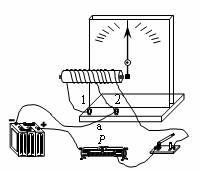 31.图是小明研究“影响电磁铁磁性强弱因素”的装置图,它是由电源、滑动变阻器、开关、带铁芯的螺线管和自制的针式刻度板组成。通过观察指针偏转角度的大小来判断电磁铁磁性的强弱。在指针下方固定小铁块,当用导线a与接线柱2相连,闭合开关后,指针发生偏转。