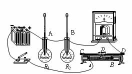 32.刘浩和李楠同学想利用图所示的装置探究“导体产生的热量与电阻大小的关系”。两瓶煤油中都浸泡着一段金属丝,烧瓶A中的金属丝是铜丝,电阻为R1,烧瓶B中的金属丝是镍铬合金丝,电阻为R2,R2> R1,温度计显示煤油的温度。