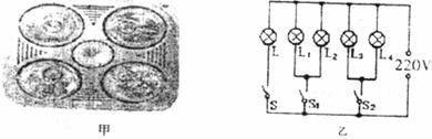 18.张宇同学家的浴室新安装了一台可供冬季取暖和照明的电器,俗称“浴霸”,如下图甲所示。它的简化电路图如图乙所示,其中L为标有“220V 40W”照明灯,L1、L2、L3、L4均为标有“220V 300W”的红外线取暖灯。