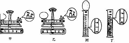 (1)把天平放在水平桌面上,把天平调平后,鸡蛋放入左侧的托盘中,用镊子把50g和20g的砝码放A右侧的托盘中,这时指针如图甲所示,然后应该操作: 正确操作后。天平的示数如图乙所示,则鸡蛋的质量是______g;然后把鸡蛋放入量筒如图丙,发现鸡蛋体积有些大,无法放入量筒中。小李想了想,他小心翼翼剥去了部分蛋清,然后把鸡蛋全部放入了量筒的水中,两次的示数如图丙和丁,则鸡蛋的体积是______cm3。,鸡蛋的密度是______kg/m3