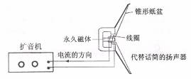 1.(4分)必要时,可用扬声器代替话筒,如图所示.人对着扬声器锥形纸盆说话,声音使与纸盆相连的线圈在_______中_______,从而产生随着声音的变化而变化的电流,这种产生电流的现象在物理学上称为_______现象.当纸盆向左运动的瞬间,产生的感应电流的方向如图中所示,若纸盆向右运动,所产生的感应电流方向与图中所标示的电流方向_______(选填“相反”、“相同”或“可能相同,也可能相反”).