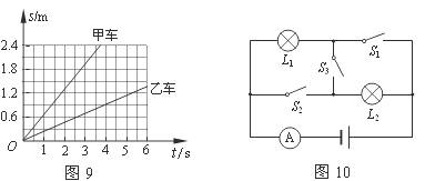 15.甲、乙两小车同时同地同方向做匀速直线运动,它们的s-t图象如图9所示。两小车的速度大小关系是v甲 v乙(填“﹥”、“﹤”或“﹦”)。