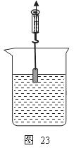 33.小红为探究物体在水中不同深度所受浮力的变化情况,她将一高为10cm的金属圆柱体挂在弹簧测力计下缓慢浸入40cm深的水中,如图23所示,在圆柱下降过程中,记录圆柱体下表面所处深度h和弹簧测力计相应的示数F。实验数据如下表所示。她分析前6组测量数据得出:金属圆柱体受到的浮力与金属圆柱体下面积浸入水中的深度h成正比。