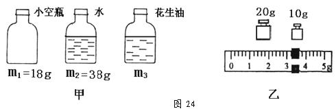 34.小玲同学想测花生油的密度,但家里只有天平(带砝码)、一个小空瓶,足量水,少量花生油(不够装满一小瓶),一只彩笔,而没有量筒。她思考后按照自己设计的实验步骤进行了测量,测量内容及结果如图24所示。